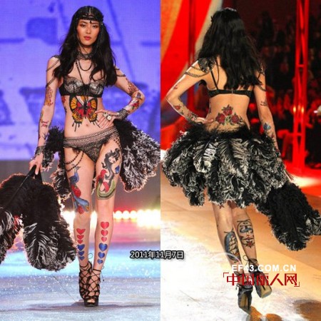 2012年这已经是刘雯第四次踏上维秘的舞台了,你可曾知道在曾经为VS工作的270多名模特中,能连续走维秘4年的不上10人,但刘雯就是其中一个。说到这儿我们可以鼓掌撒花。今年虽说只有一身LOOK,全身绘满了美人鱼,蝴蝶等图腾,加上编织的发辫,在甩着“鸡毛掸”化身土著女首领,这才叫风情中流露着霸气。