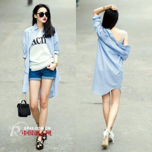 蓝白的条纹衬衫也是夏日必不可少的,白色的字母T恤和深蓝色的牛仔卷边短裤,如此休闲的搭配却也不失风情,这得归功于这件竖条纹的中长款衬衣了,风情万种也不过如此。