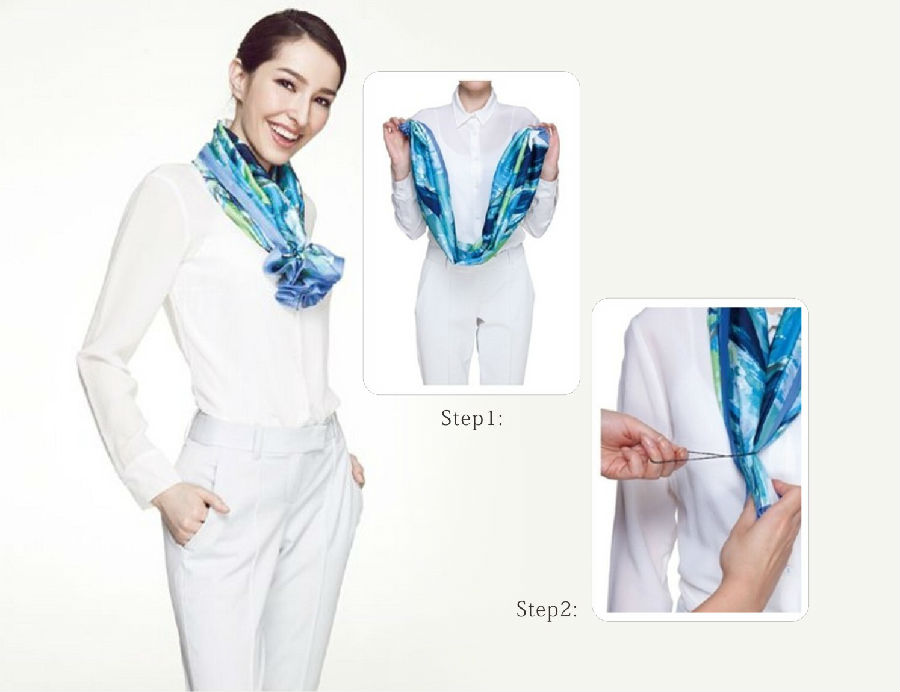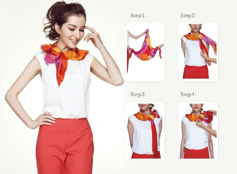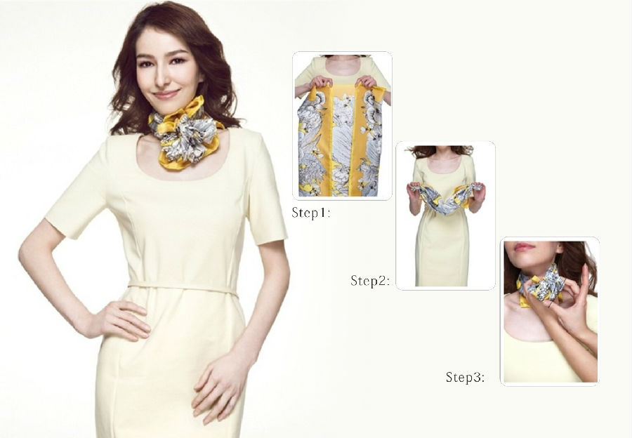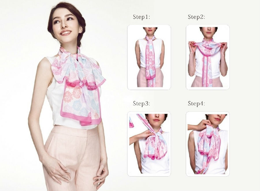 Step4:将丝巾扣放在胸前、两头绕于脖子后面系结,