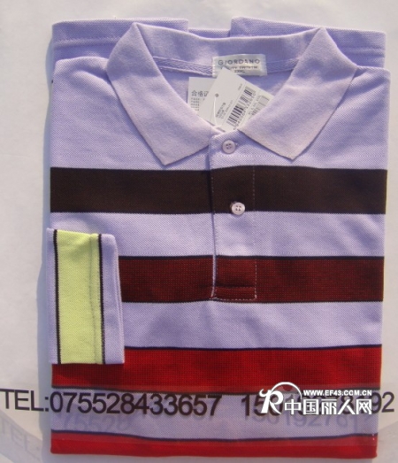 佐丹奴男式翻领休闲T恤批发 佳利服装厂 纯棉T恤生产厂家,主要生产佐丹奴 KAPPA 保罗 鳄鱼等休闲T恤和安踏等运动装,纯棉面料,做工精细,全部双吊牌,单件独立包装,按照新款制作,齐色齐码正品货,夏装短袖7-12元,长袖秋冬装8-16元批发,300件起发物流,可以混批,并承接各式制服,厂服,广告衫,文化衫,校服以及各类专业服装订做.本厂可提供看图出样,包工包料生产,也可来料加工,订货预付定金20%,余款等货到当地货运站,见货付全款,也可到厂里提货,专车接送,量大从优 联系电话:0755-28433657 15019278192 唐小姐 业务QQ:122403262