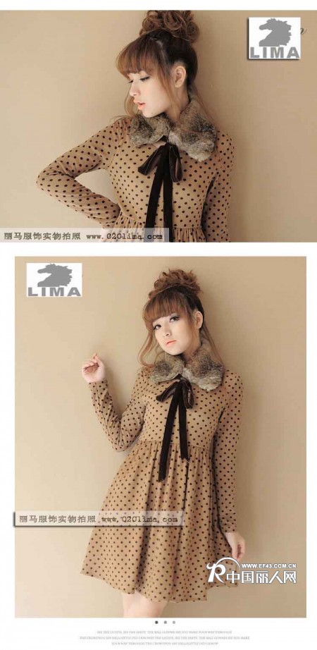 【供应】可卸兔毛领圆点连衣裙结合毛领波点复古元素淘宝网热销款