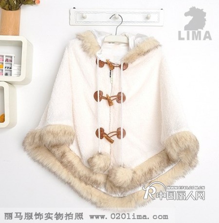 毛毛款是今年的时尚,再添加斗篷式的设计更显今年流行的主题。这款经典的斗篷在今年根据日本流行做了改版,拉链变成了可爱的牛角扣,显更加可爱了,更加年轻、更加美丽。此新款两个色,白色和杏色,丽马服饰厂家直批中心欢迎广大客户选购。