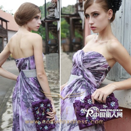 新款时尚潮流礼服,绣花紫色潮流新款礼服,独特的印花纱面料,紫色的花朵点缀其中,从视觉上给人独特、大方、梦幻的观感,加上独特的印花真丝纱面料的裙摆,有种朦胧、婉约的飘逸美。
