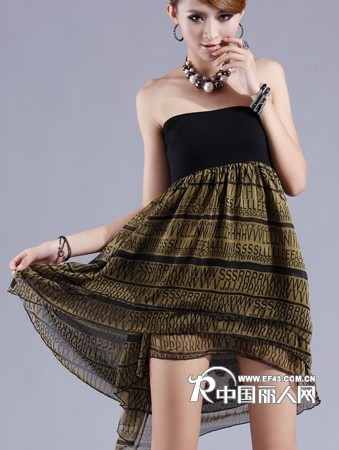 2012韩版时尚女装最新款气质优雅雪纺印花连衣裙款式图片半裙,抹胸连衣裙 一件衣服两种穿法 前短后长下摆 拉长身体比例。随着阳光开始越来越多的散播,夏天的温情已经不能阻止了。冬天臃肿厚重的穿着开始逐渐褪去,夏日的装扮可以用最明媚的态度来宣告自我。像是博奕中轮盘的黑色数字,辉煌且富饶、娇贵又剔透。以摩登的手法,混合理性的自制与感性的波西米亚精神。