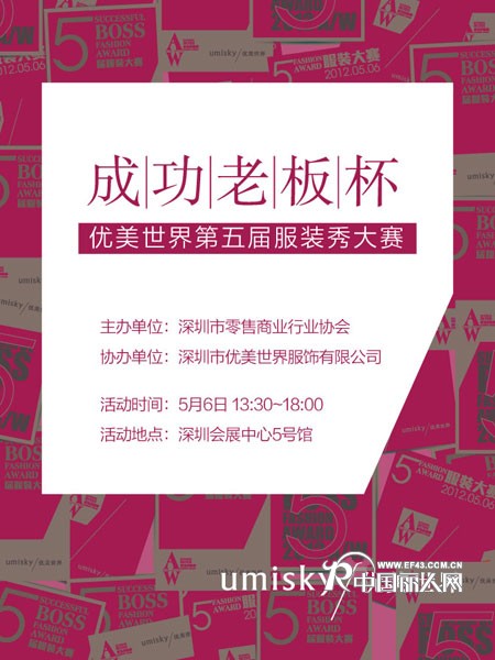 优美世界第五届“成功老板”杯服装秀大赛暨2012秋冬新品发布将于5月6日下午14:00在深圳会展中心五号馆举行,欢迎莅临现场观赏。