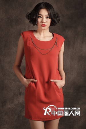 连衣裙 红色依然是女生最喜爱的颜色,因为红色象征着高雅、喜气,又带着无比的幸运,同时让人看起来年轻充满活力。 这件无袖红色连衣裙,圆圆的领口和无袖的款式,整身的剪裁很一致,胸前有拉链和垂坠的金属链作为装饰,让胸前显得不那么空,也为胸部增加了一点分量,将人的视线提升到人的上半身。