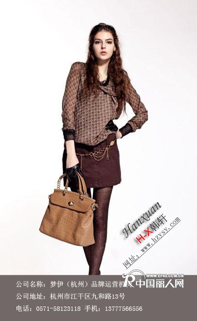 杭州梦伊服饰有限公司是全国第一家超值特卖连锁机构。旗下主打品牌“H-X韩轩”女装最受20-45岁追求时尚/热爱个性的女性喜爱!演绎出女性优雅、知性、时尚的精致生活。H-X韩轩女装坚信让世人因韩轩而充准时满魅力。H-X韩轩女装传承了优雅时尚风情。 高档的品质和优惠的价格,深受女性的青睐。 杭州梦伊服饰有限公司采用当前国际流行的outlets(品牌折扣)销售模式在原有的品牌折扣女装库存批发基础上,经营主要致力于女装加盟,品牌折扣女装、瑞丽女装、韩版女装等女装批发加盟长期供应最新潮流行服饰,风格独特。产品100%都为实物拍摄。全面诚招特许品牌女装折扣店代理加盟,进一步拓展全国市场。 加盟:免加盟费、免保证金、100%调换货、零库存、盈利模式成熟、轻松获利!拒绝货不对版,款款都有安全保障.交易无障碍.诚信经营,用心待客! 品牌丰富,大量的品牌女装价格超值,无中间环节,保证最低价位供货,及适当的现金返利 杭州H-X韩轩品牌折扣女装秉承“诚信至上,双赢发展”的理念,为致力于服装业的朋友造就财富! 同时欢迎来公司考察.携手共进,共同发展! 下面是加盟联系方式,欢迎来电咨询!