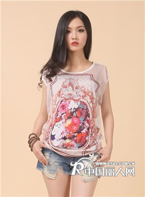 在炎热夏季,许多女性都选择雪纺面料的衣着,而这款时尚T恤正合炎热夏季的女性穿着,胸前印有极时尚的