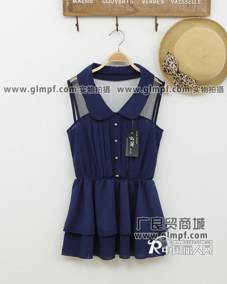 库存-亮色时尚无袖雪纺上衣批发韩版新款净色收腰背心裙批发翻领雪纺衫
