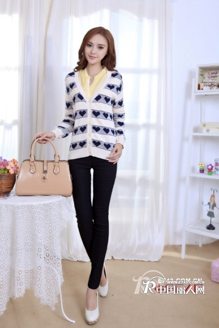 条纹的针织开衫也是当下最流行的元素,还有一条条的桃心装饰,休闲中也有强烈的跃动感,彰显了女性细腻的品味,浅黄色的内搭更显活跃青春的气息,黑色的休闲裤张扬着柔美。