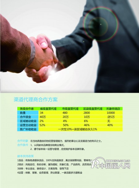 四、其它的如培训、外阜店管理等扶持。请您相信 我们做的是特色, 做的是品牌,做的是直营合作,不是散货也不是单纯的品牌代理加盟,华城衣秀诚挚欢迎每位热爱服装的朋友前来洽谈!
