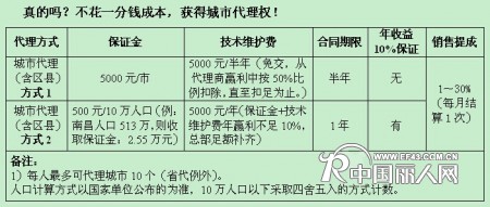 备注:不经公司审核通过即先付款抢占城市代理名额者,视为恶性竞争,作无效处理。必须先经公司审核通过,并签订城市代理合同后,再按标准支付相应款项者方为有效代理商。