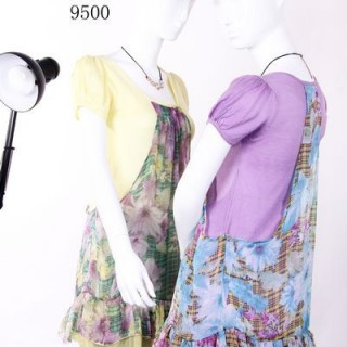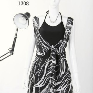 供应-特加依-13107折扣女装时尚圆领橡筋袖腰间撞网布珠片