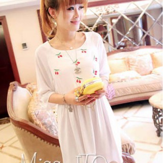 [供应]甜美樱桃刺绣图案花边袖纯色百搭雪纺连衣裙