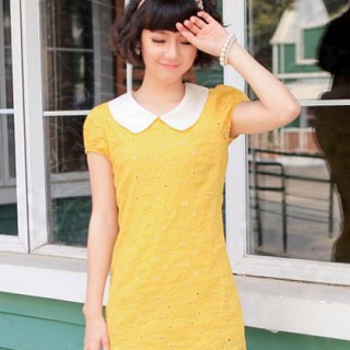 [供应]韩国拼接撞色蕾丝钩花镂空复古娃娃领修身短袖连衣裙