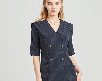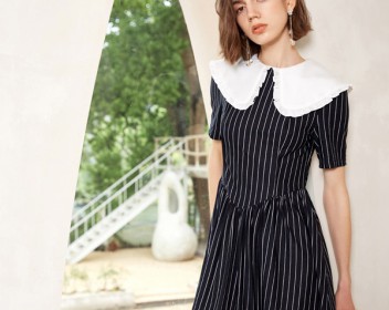 竖条纹会给人干净明亮,这件黑色竖条纹舒适,修身的版型更加知性大方,娃娃领的设计更加的甜美清新,花边更增加一丝精致的感觉,整体看上去非常的温柔大方,裙长也在膝盖处,日常穿也十分的方便,夏天值得入手哦!