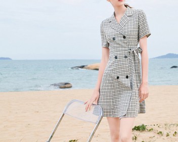 格子套装裙,干练优雅,仿西装设计更加大气简约,翻领更具气质,细格子更加的精致,清新的绿色条纹增加了复古的味道,腰间的系带设计更好的体现女性的柔美,门襟采用纽扣,经典大气,短款版型不仅清凉也十分的舒适。