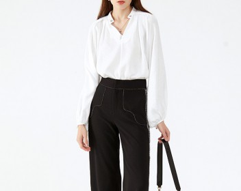 黑色阔腿裤可以说是非常简单也是非常提升气质的一款单品了,不管是搭配什么上衣都能够很好的展现气质,最简单的搭配就是白色衬衫的搭配了,选择一款修饰脸型的白色衬衫,例如小编推荐的这款带有V领设计的上衣(适合圆脸以及方脸的妹纸们)简约又大气还带有些许的小性感,鞋子选择一双带有跟的高跟鞋就非常OK了~或者还是不放心那就选择不容易出错的黑色高跟鞋吧!